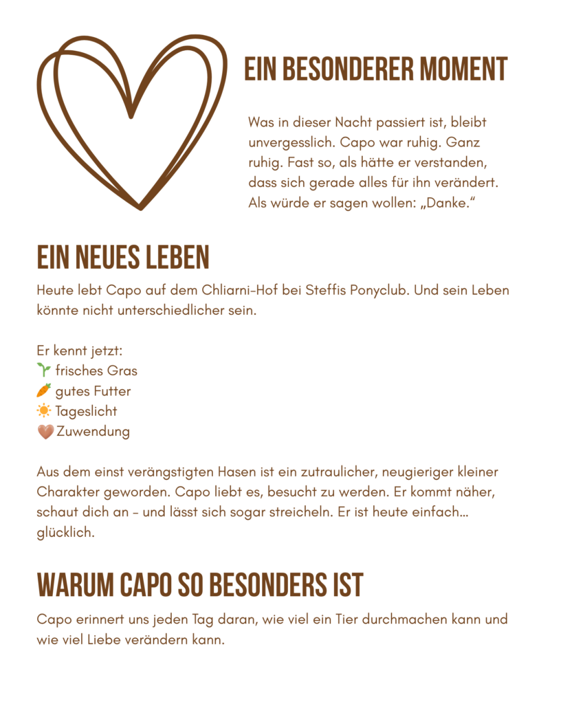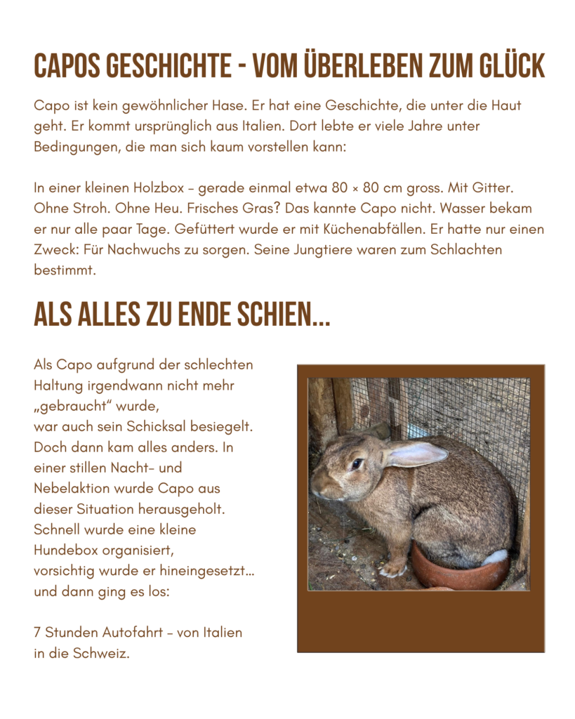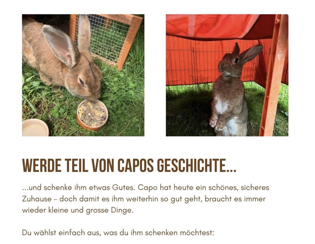 🥕 Sein Lieblingsessen: Frische Karotten / Äpfel / Körnlimix (CHF 5.00) ☀️ Etwas für sein Gehege, zB. Sonnendach, frisches Heu etc. (CHF 20.00) 🏥 Gesundheitscheck / Krallenpflege / Zahnpflege (CHF 50.00) 💚 Oder einfach einen freien Beitrag deiner Wahl